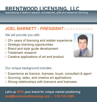 Contact Joel Barnett at JoelB@BrentwoodLicensing.com or 310-720-3285
